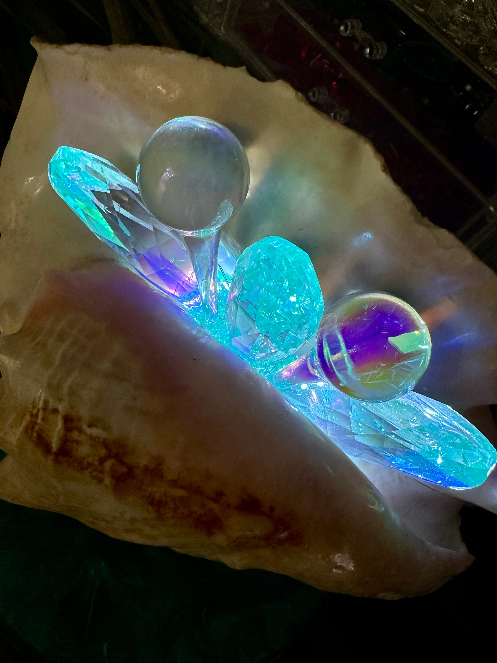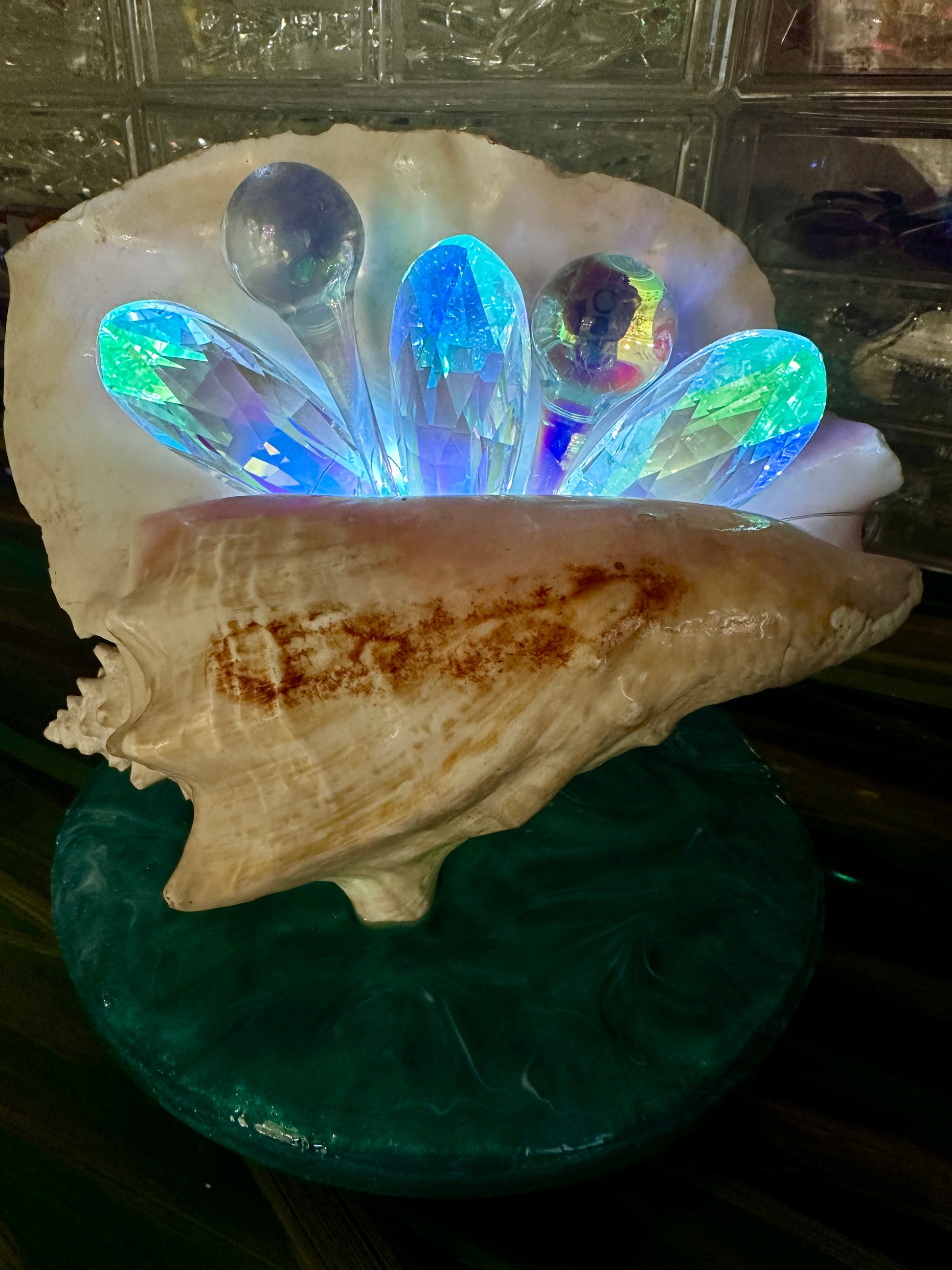 Start conversations and set the Dazzling mood with this one-of-a-kind illuminated Queen Conch Shell. Lit from within, the Aurora Borealis crystals sparkle brilliantly, creating a magical glow that shines through every curve of the shell.