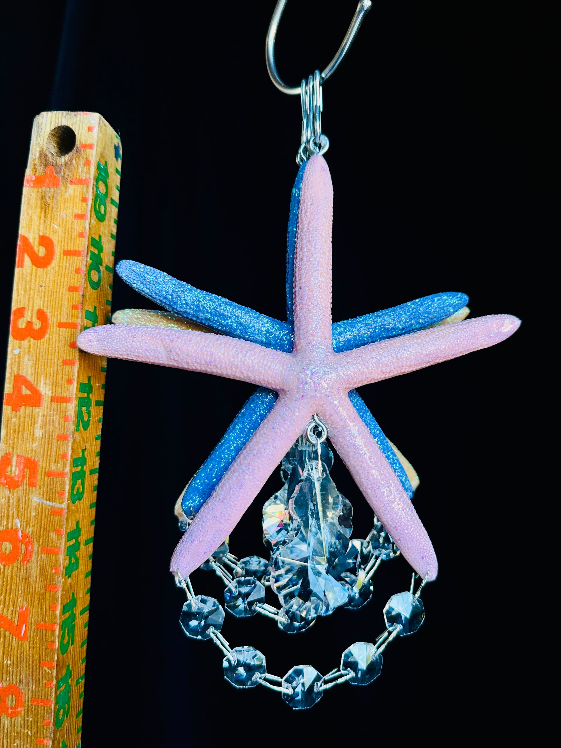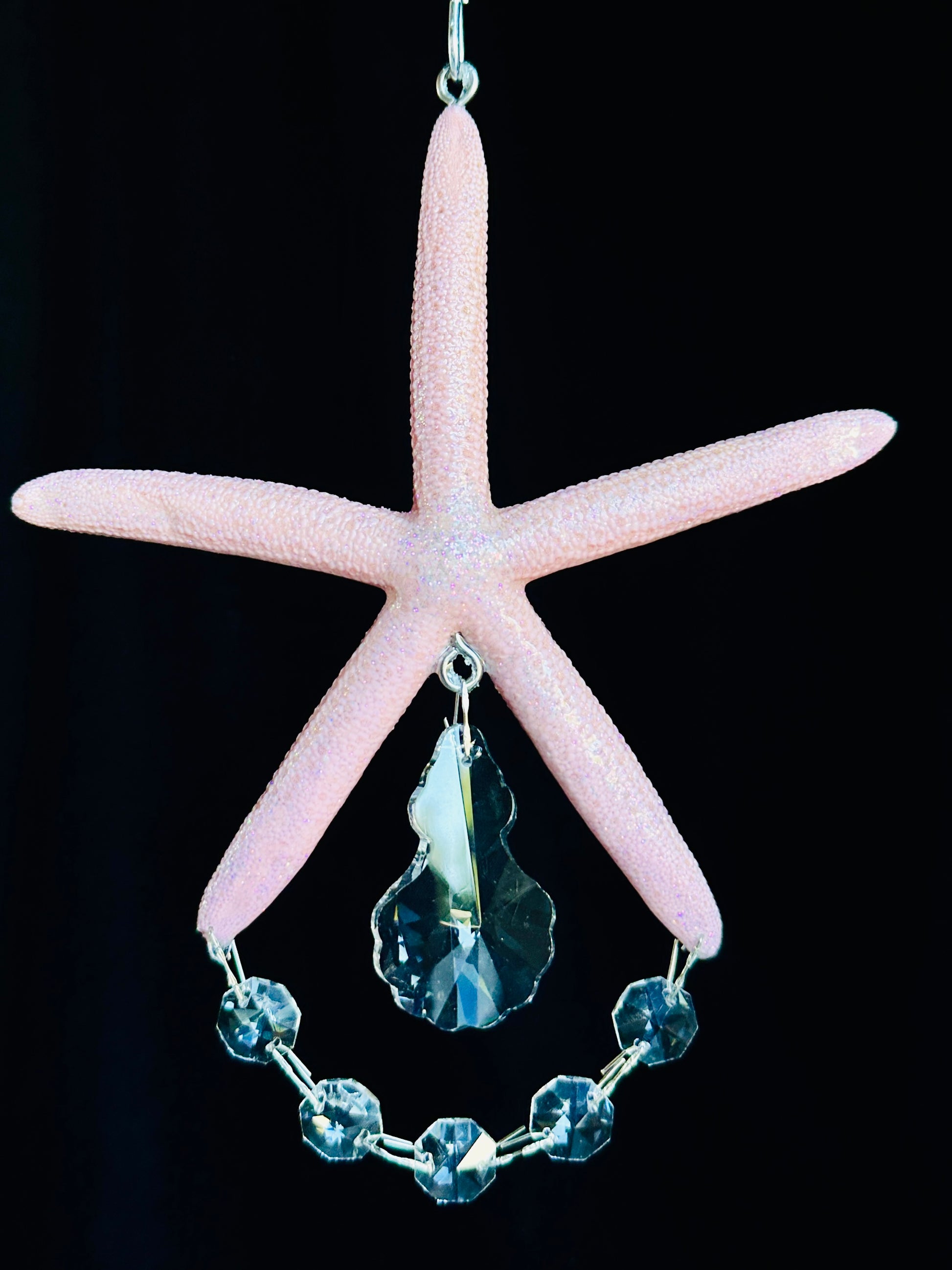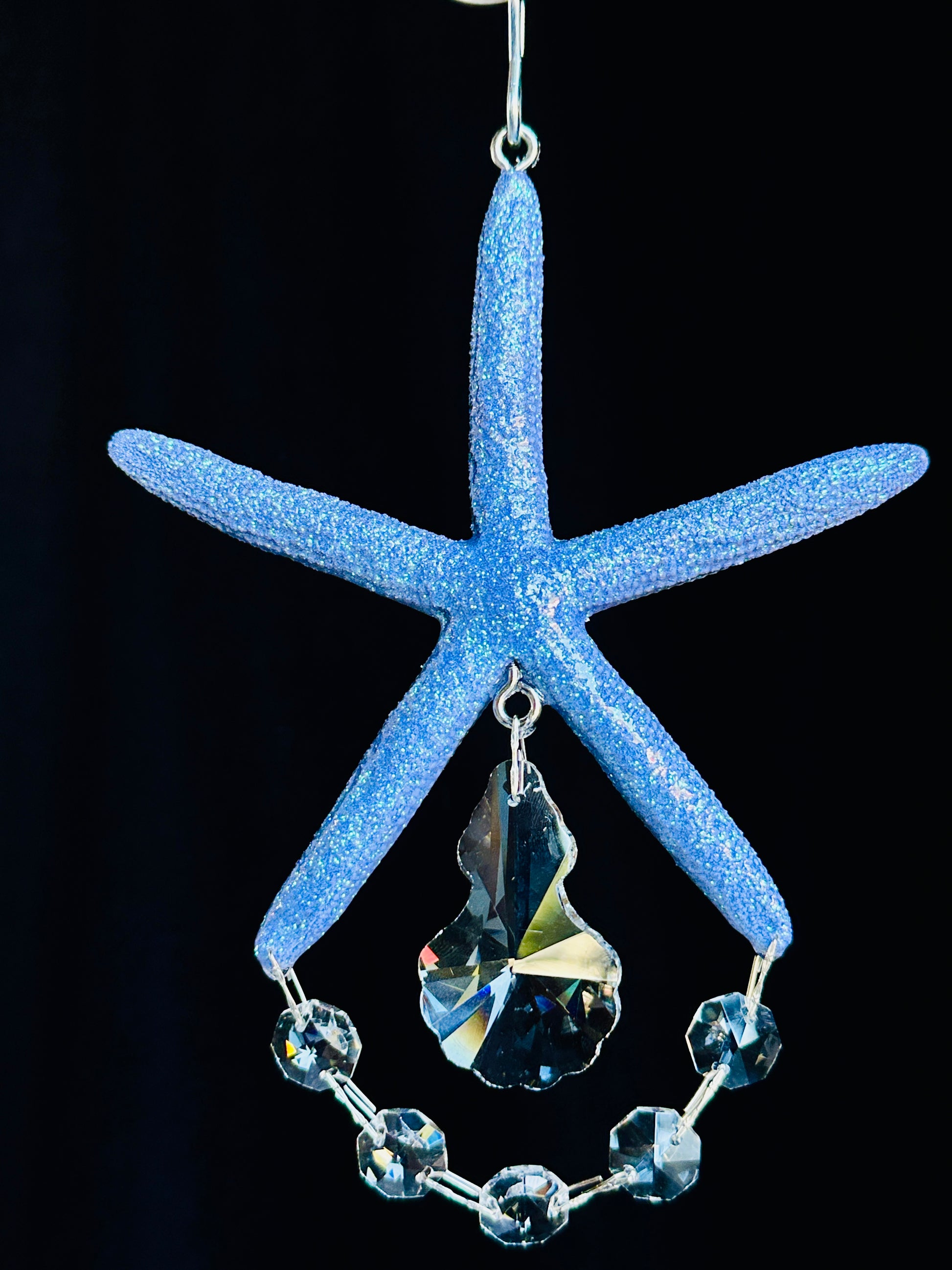 The large starfish measure approximately 7" tall by 5.5" wide and feature a shimmering scallop-shell crystal paired with a strand of five elegant valance crystals. The small starfish, measuring 5" tall by 4.5" wide, are adorned with an iridescent aurora borealis teardrop crystal.